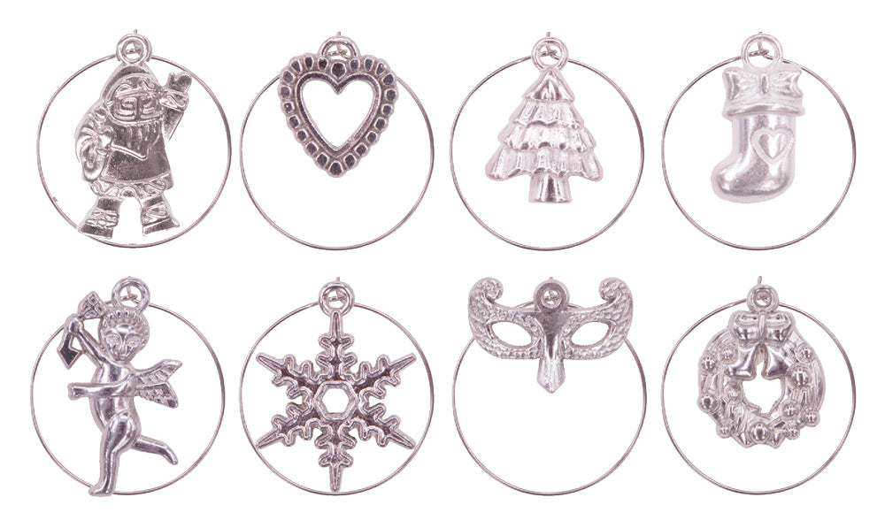 Each CC-MT cracker contains a hat, satisfying snap, amusing joke/motto & one of the following wine charms: masquerade, cupid, heart, Christmas tree, Santa Claus, Christmas wreath, snowflake and stocking.